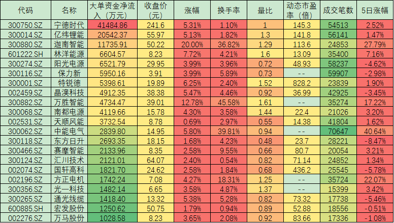 正如分析人士所言,景氣度和業績帶來了投資熱度和市場風口,同時,市場資金也開始積極布局,其中,寧德時代(41484.86萬元)、億緯鋰能(20542.37萬元)、迦南智能(11735.91萬元)等3只個股大單凈流入均超1億元,另有包括林洋能源、陽光電源、保力新等在內的18只個股大單凈流入額均超1000萬元,以上21只個股合計大單凈流入13.43億元。