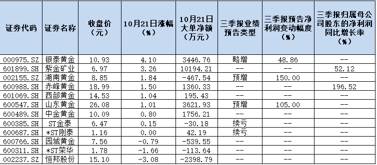 表:黃金股10月21日市場表現(xiàn)一覽