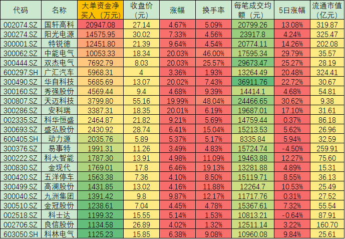 表:周一大單資金凈流入超1000萬元充電樁股一覽