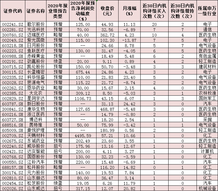 表:機構近30日內給予“買入”或“增持”以上評級的年報預喜公司情況: