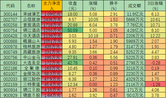 CPI中相關數據的向好帶來資金對部分旅游酒店股的關注?!蹲C券日報》記者通過IFIND統計發現,周二,旅游酒店中有16只個股獲大單資金凈流入,其中,宋城演藝獲得1.09億元大單凈買入,此外,尚有包括眾信旅游(2436萬元)、首旅酒店(1718萬元)、錦江酒店(1255萬元)在內的5只個股凈流入超1000萬元,以上6只個股合計大單凈流入1.85億元。
