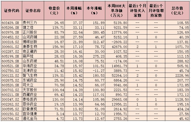 表:本周累計漲幅超13%生物醫藥行業個股一覽