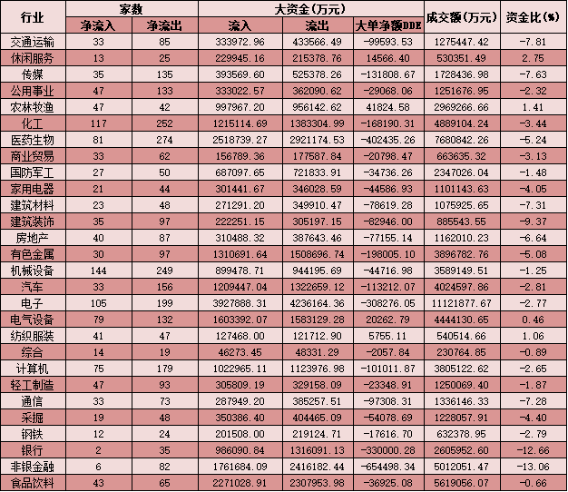 從資金層面看,市場大單資金延續凈流出態勢,周一,整個市場資金凈流出金額達306.80億元。僅農林牧漁(4.18億元)、電氣設備(2.03億元)、休閑服務(1.46億元)、紡織服裝(0.58億元)等四大行業呈現大單資金凈流入態勢。