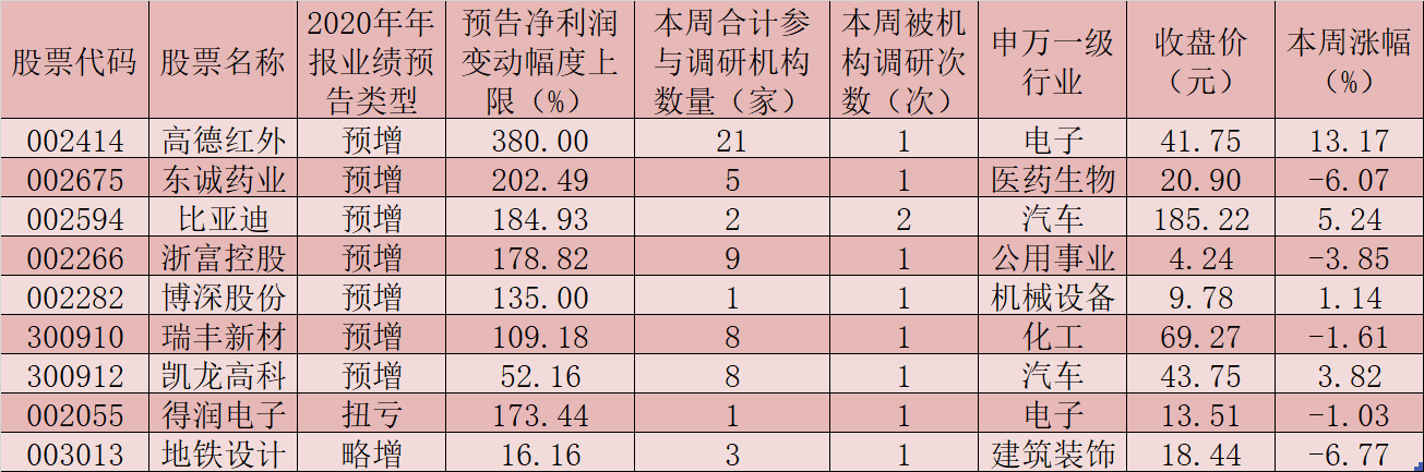 良好的年報業績預期向好或是本周機構頻繁調研的重要動力。在上述本周被機構調研的79家公司中,截至12月27日,已有14家公司率先披露了2020年年報業績預告,業績預喜公司共有9家,占比逾六成。高德紅外、東誠藥業、比亞迪、浙富控股、博深股份、瑞豐新材等6家公司均預計2020年全年凈利潤同比翻番。