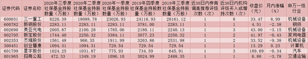 表:近30日內(nèi)獲券商調(diào)高推薦評(píng)級(jí)且被社保連續(xù)五個(gè)季度持倉(cāng)的個(gè)股