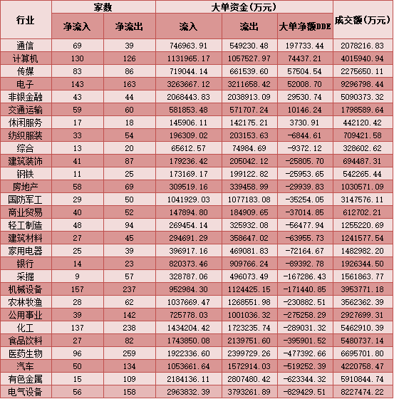 從資金層面看,市場大單資金延續凈流出態勢,周二,整個市場資金凈流出金額達400.55億元。行業方面,有7類行業呈凈流入態勢,資金流入最高的通信凈流入額達19.77億元。
