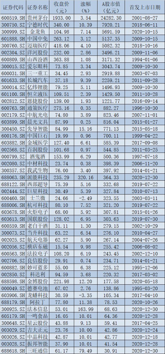 個股方面,包括年內上市新股,共有49只個股股價創歷史新高,其中,最新A股總市值在1000億元以上個股達到13只,占比近三成。貴州茅臺、寧德時代、金龍魚、中國中免、邁瑞醫療等5只個股最新A股總市值均在5000億元以上,分別為,24282.30億元、7920.21億元、5691.59億元、5137.35億元、5082.32億元。
