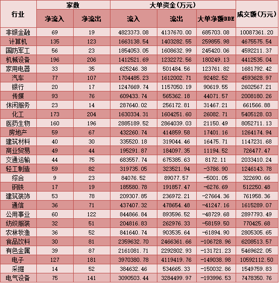 從資金層面看,市場大單資金呈凈流入態勢,周四,整個市場資金凈流入金額達87.02億元。行業方面,有15類行業呈凈流入態勢,資金流入最高的非銀金融凈流入額達68.57億元。