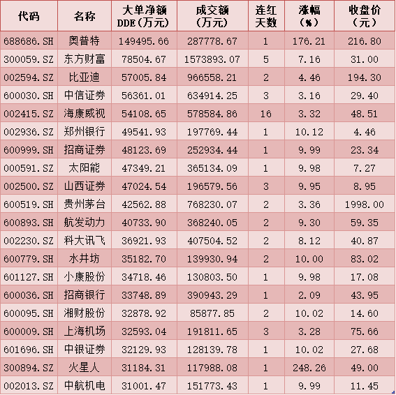一、周四(12月31日)DDE大單資金凈買入TOP20