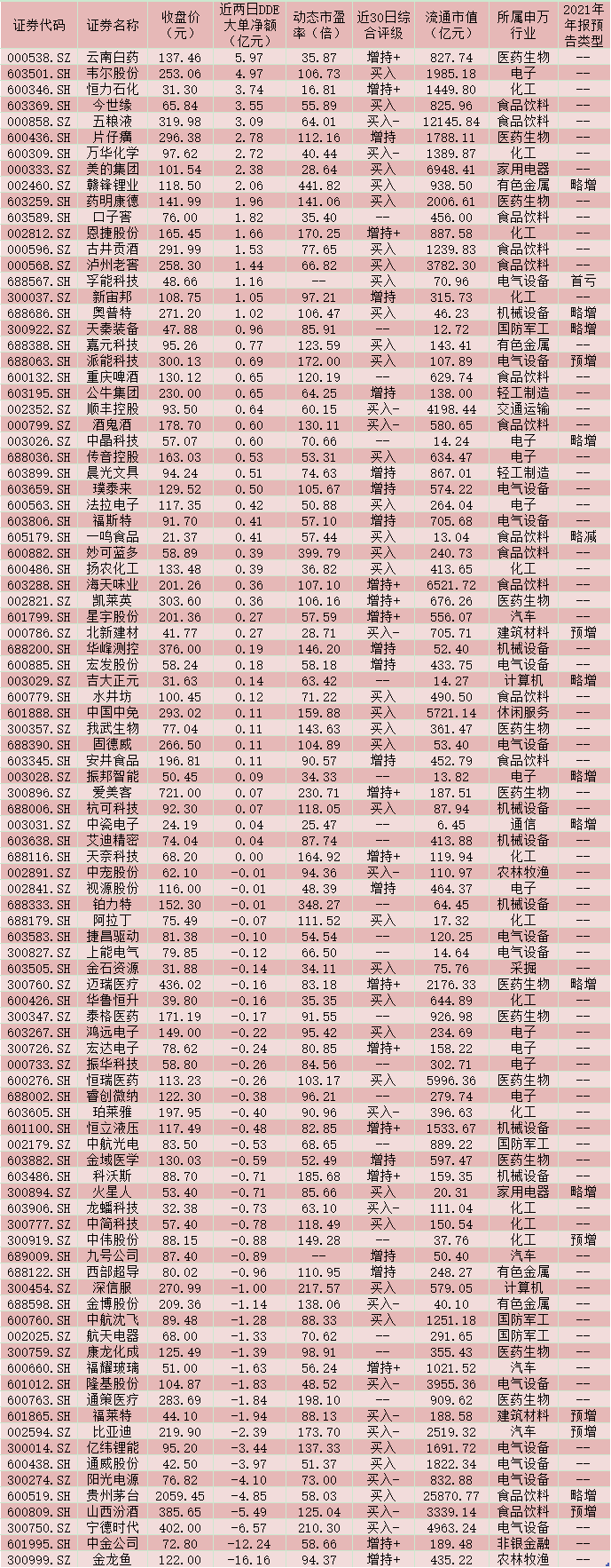 其次,資金關(guān)注度高。從資金流向來看,統(tǒng)計(jì)發(fā)現(xiàn),今年以來的兩個(gè)交易日中,在上述95只個(gè)股中,有51只個(gè)股呈現(xiàn)DDE大單資金凈流入狀態(tài),占比超五成。其中,云南白藥(5.97億元)、韋爾股份(4.97億元)、恒力石化(3.74億元)、今世緣(3.55億元)、五糧液(3.09億元)、片仔癀(2.78億元)、萬華化學(xué)(2.72億元)、美的集團(tuán)(2.38億元)、贛鋒鋰業(yè)(2.06億元)等9只個(gè)股DDE大單資金凈流入均超2億元。