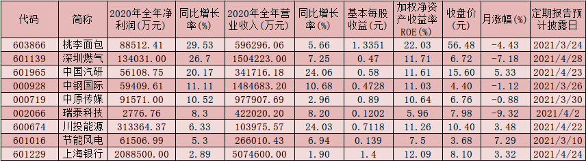 從凈利潤同比增幅來看,上述9家公司中,桃李面包凈利潤同比增長居首,達到29.53%,而深圳燃氣(26.7%)、中國汽研(20.17%)、中鋼國際(11.11%)和中原傳媒(10.52%)等公司2020年全年凈利潤都同比增長也均在10%以上。
