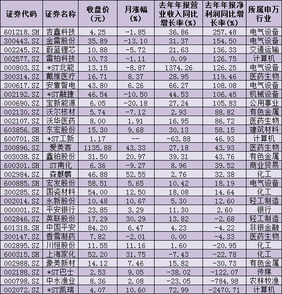 《證券日報》根據(jù)同花順統(tǒng)計發(fā)現(xiàn),截至2月19日收盤,滬深兩市已有30家公司披露了2020年年報業(yè)績。其中,21家公司歸屬母公司凈利潤實現(xiàn)同比增長,占比70%。吉鑫科技、金雷股份、蔚藍鋰芯、雷柏科技、*ST北能、戴維醫(yī)療、安靠智電、*ST融捷、寶新能源等9家公司,年報凈利潤同比增幅均超100%。