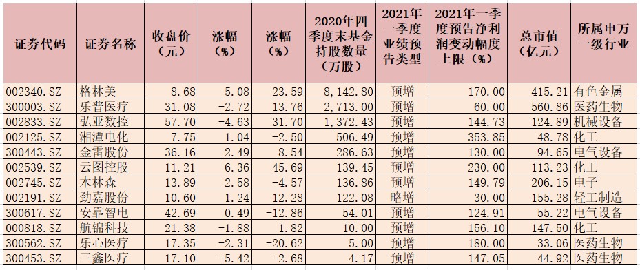 表:去年四季度末基金持倉并披露2021年一季度業績預告的公司一覽