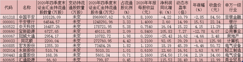 《證券日?qǐng)?bào)》記者根據(jù)東方財(cái)富Choice數(shù)據(jù)統(tǒng)計(jì)發(fā)現(xiàn),截至3月5日收盤,在已披露2020年年報(bào)的上市公司中,有10家公司的前十大流通股股東中出現(xiàn)證金匯金的身影,合計(jì)持股市值達(dá)1081.45億元,這10只個(gè)股被證金匯金連續(xù)五個(gè)季度持倉,持股數(shù)量未發(fā)生變化。