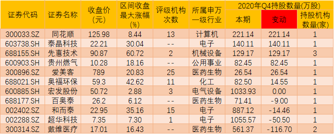 具體來看,新進增持方面,截至2020年四季度末,QFII新進同花順、泰晶科技、先惠技術、貴州燃氣、愛美客等5只個股,并對奧福環保進行繼續加倉操作,QFII增持數量為14.55萬股,最新持股數量為82.50萬股。此外,還持有宏發股份1033.93萬股未動,對百奧泰、和而泰、超華科技和戴維醫療則有所減倉。