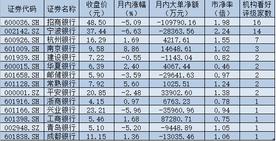 投資品種方面,包括平安證券、安信證券、廣發證券等在內的多家券商在3月份以來發布近80份研報力挺銀行股走勢。其中14只銀行股被高頻推薦,招商銀行、寧波銀行等券商看好評級家數均在10家以上,分別為16家、14家。