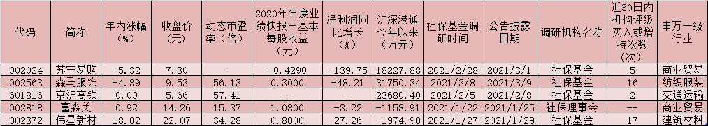 表:年內(nèi)獲社保基金調(diào)研的個股一覽
