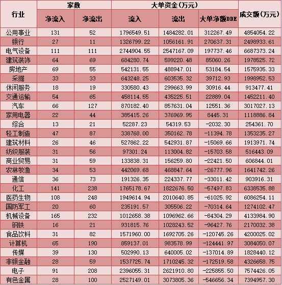 從資金層面看,市場呈大單資金凈流出態勢,周五,DDE大單凈額流出達61.85億元。行業方面,有10類行業呈凈流入態勢,前三位分別為:公用事業(312267.49萬元)、銀行(270637.31萬元)、電氣設備(197737.46萬元)。