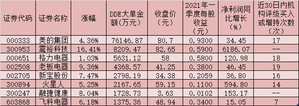 表:5月20日受到千萬元以上大單資金追捧的家用電器股