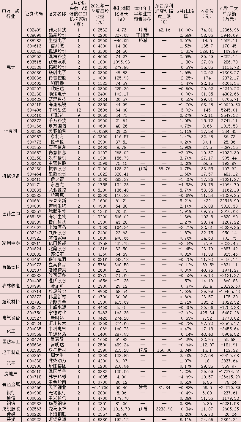 在上述5月份以來被QFII調研的74家公司中,72家公司2021年一季度實現凈利潤同比增長,占比逾九成。其中,有36家公司報告期內實現凈利潤同比翻番。截至目前,有7家公司率先披露了2021年上半年業績預告,森馬服飾、雙星新材、杭氧股份、雅克科技等4家公司業績預喜。