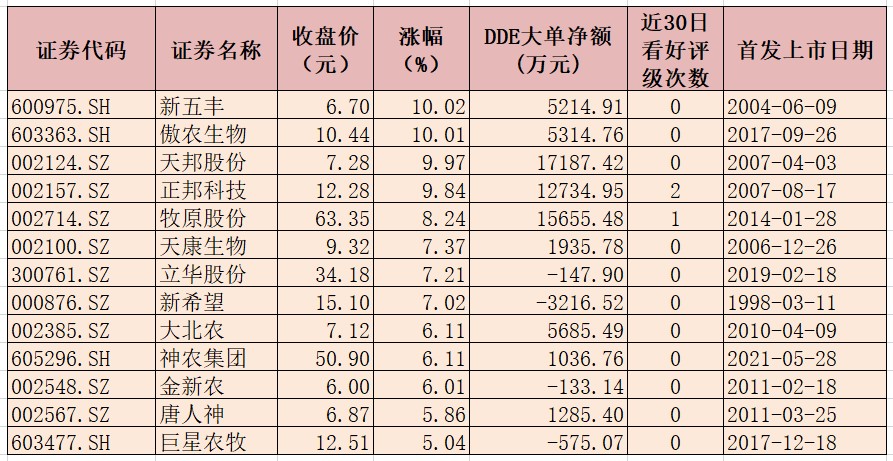 最近30日內,也有券商機構對于豬肉概念股表示看好,具體來看,有7只概念股獲機構給予“買入”或“增持”等看好評級,其中,正邦科技和海大集團獲得看好評級次數均為2次,華統股份、牧原股份、順鑫農業、湘佳股份、溫氏股份等5只個股看好評級次數均為1次。