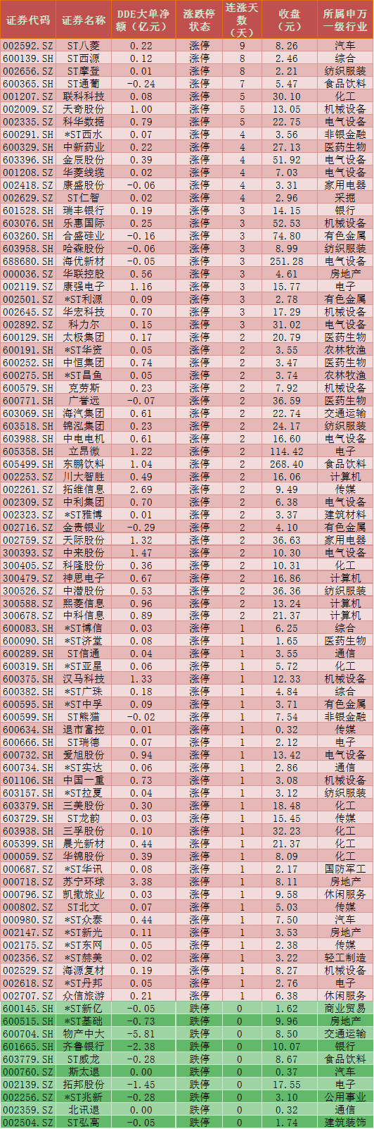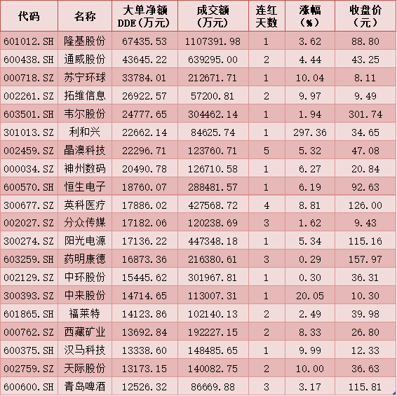 一、周二(6月29日)DDE大單資金凈買入TOP20