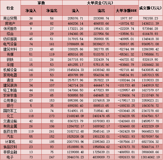 從資金層面看,周二市場呈大單資金凈流出態勢,為連續第24個交易日凈流出,周二DDE大單凈額流出達253.40億元。行業方面,僅有商業貿易行業呈凈流入,流入資金為1977.97萬元。