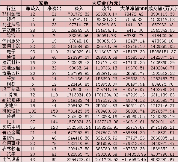從資金層面看,周三,A股大單資金整體凈流出110.58億元,其中,有1502只個股呈現資金凈流入,有2785只個股呈現資金凈流出。從申萬一級的28個行業來看,非銀金融、銀行、商業貿易等3個行業呈現資金凈流入態勢,分別為7.85億元、0.75億元和0.14億元。另外,25個行業均呈現資金凈流出態勢,其中,電氣設備和汽車等兩個行業,資金凈流出均超10億元。