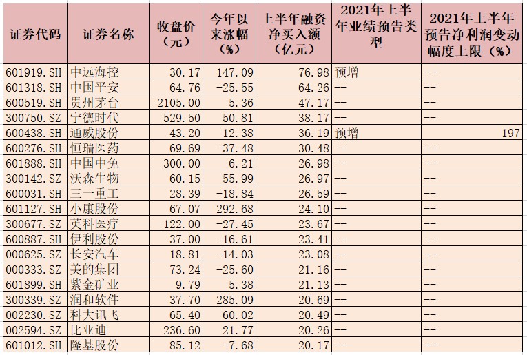 個股方面,今年上半年,共有1058只股票獲融資客加倉,其中,有440只個股期間融資凈買入額均超過1億元,中遠海控、中國平安、貴州茅臺期間融資凈買入額居前三,分別為76.98億元、64.26億元、47.17億元,寧德時代、通威股份、恒瑞醫藥、中國中免、沃森生物、三一重工等6只個股期間融資凈買入額均超過26億元。