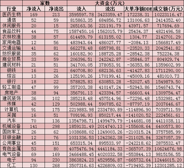 從資金層面看,周一,A股大單資金整體凈流出369.5億元,其中,有1411只個股呈現資金凈流入,有2901只個股呈現資金凈流出。從申萬一級的28個行業來看,僅有5個行業呈現資金凈流入態勢。其中,醫藥生物和通信等2個行業資金凈流入均超10億元,分別為17.22億元和13.1億元。另外,23個行業均呈現資金凈流出態勢,其中,化工、電子、電氣設備、有色金屬等四行業,資金凈流出均超30億元。