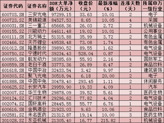 一、周二(7月20日)DDE大單資金凈買入TOP20