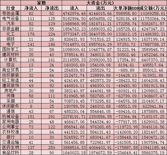 從資金層面看,周三,A股大單資金整體凈流入21.38億元,其中,有1617只個(gè)股呈現(xiàn)資金凈流入,有2693只個(gè)股呈現(xiàn)資金凈流出。從申萬一級(jí)的28個(gè)行業(yè)來看,僅有11個(gè)行業(yè)呈現(xiàn)資金凈流入態(tài)勢(shì)。其中,有色金屬和電氣設(shè)備等兩個(gè)行業(yè)資金凈流入均超50億元,分別為59.9億元和52.8億元,合計(jì)達(dá)112.7億元。另外,17個(gè)行業(yè)均呈現(xiàn)資金凈流出態(tài)勢(shì),其中,食品飲料、醫(yī)藥生物、交通運(yùn)輸、銀行、農(nóng)林牧漁、公用事業(yè)等行業(yè),資金凈流出均超10億元。