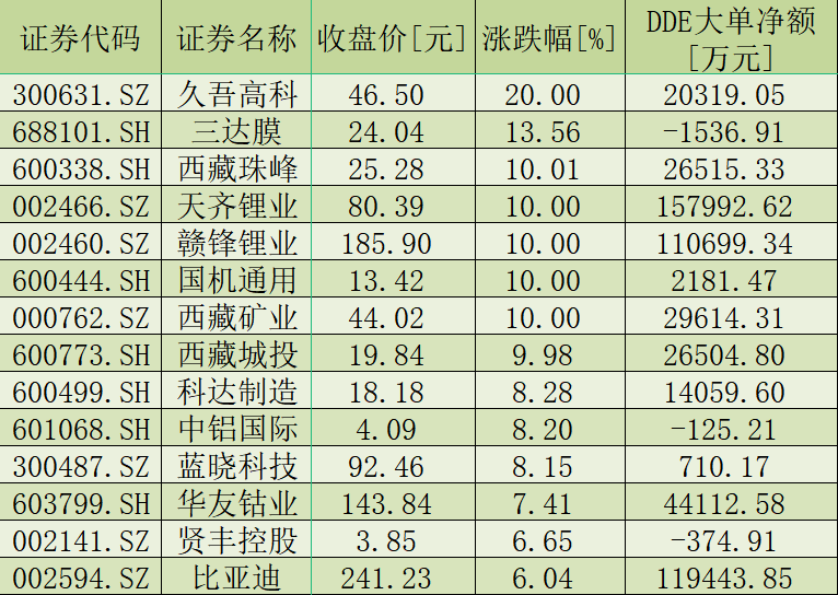 當然,鹽湖提鋰板塊的行情也與資金面因素相關。今日,鹽湖提鋰板塊大單資金凈買入額為56.53億元,共有15只個股呈現大單資金凈買入狀態,期間合計凈買入金額達到57.7億元。具體來看,天齊鋰業(157992.62萬元)、比亞迪(119443.85萬元)、贛鋒鋰業(110699.34萬元)3只個股獲大單資金凈買入額均超10億元;華友鈷業(44112.58萬元)、西藏礦業(29614.31萬元)、西藏珠峰(26515.33萬元)、西藏城投(26504.80萬元)、億緯鋰能(23569.89萬元)等個股獲大單資金凈買入額超2億元。