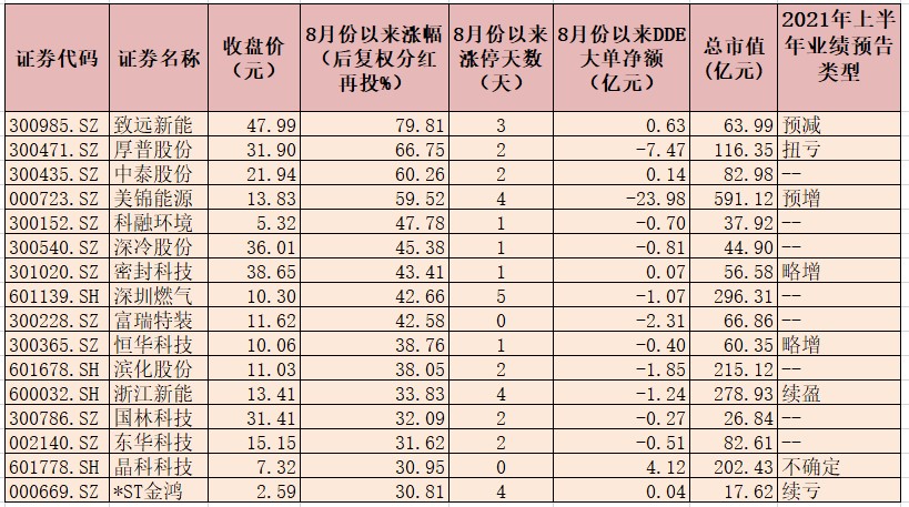 表:8月份以來漲幅超30%的氫能源股一覽