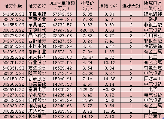 一、周二(8月17日)DDE大單資金凈買入TOP20
