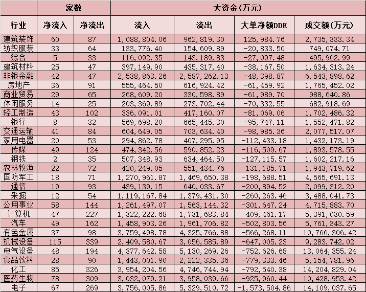 從資金層面看,周二,A股大單資金整體凈流出887.52億元,為年內最高凈流出額。其中,有1082只個股呈現資金凈流入,有3307只個股呈現資金凈流出。從申萬一級的28個行業來看,僅有建筑裝飾行業呈現資金凈流入態勢,大單資金凈流入為12.60億元。另外,27個行業均呈現資金凈流出態勢,其中,電子、醫藥生物、化工等行業,大單資金凈流出均超70億元。