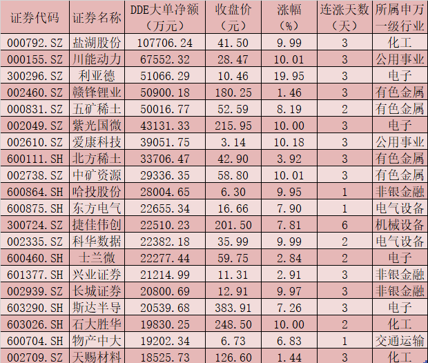 一、周五(8月20日)DDE大單資金凈買入TOP20
