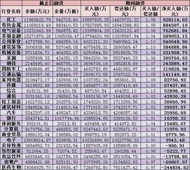從行業分布來看,9月份以來,在28個申萬一級行業中,23個行業期間獲融資凈買入。其中,化工、有色金屬、電氣設備等三行業最受融資客青睞,融資凈買入額均超70億元,分別為92.81億元、88.45億元和76.27億元,合計達257.53億元;緊隨其后的是非銀金融、公用事業等兩行業,融資凈買入額均超50億元。
