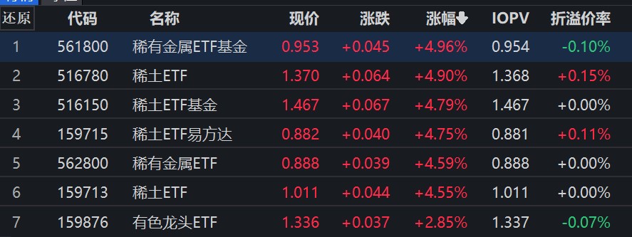 受到多重利好消息刺激,11月17日,稀土永磁板塊全天持續拉升,截至收盤,板塊整體漲4.5%,位列同花順板塊漲幅榜前列,值得關注的是,寧波韻升、科恒股份、北礦科技、德宏股份、橫店東磁、華宏科技、宇晶股份等7只個股漲停。與此同時,多只稀土ETF也位列ETF漲幅榜前列。