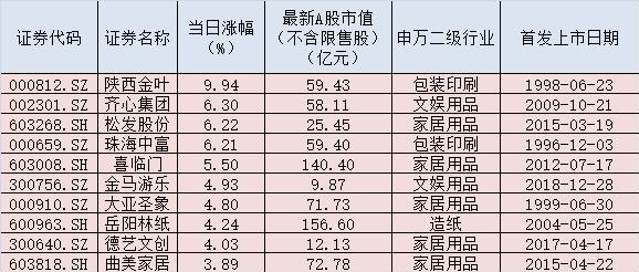 從當日市場表現來看,中銳股份收獲一字漲停板,齊心集團、松發股份、珠海中富、喜臨門等個股漲幅均超過5%。