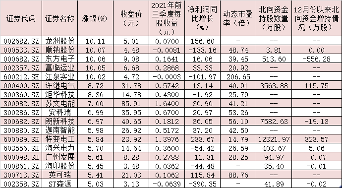 受利好提振,12月15日,充電樁板塊指數表現強勢,盤中板塊指數最高上探至4912.44點,創下2015年6月15日以來的階段新高,該板塊指數整體逆市上漲1.2%,跑贏上證指數(跌幅為0.38%),位居大智慧板塊漲幅榜前列。具體到個股方面,龍洲股份、順鈉股份、東方電子、富臨運業、江泉實業、ST森源等6只概念股漲停,許繼電氣、炬華科技、蘇文電能、安科瑞、朗新科技也分別大漲8.72%、8.36%、7.60%、6.99%、6.97%。值得一提的是,國電南瑞、安科瑞、思源電氣等3只概念股今日盤中股價創出歷史新高。
