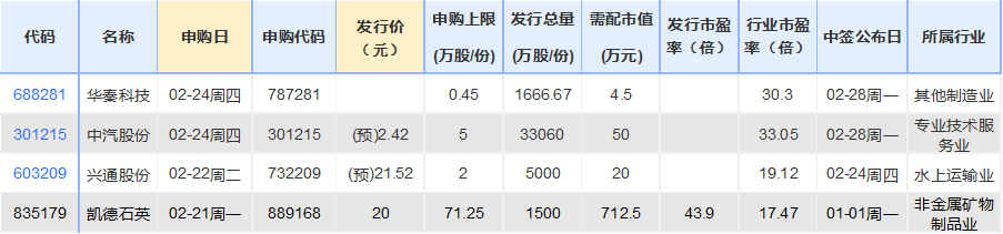 根據(jù)發(fā)行安排,下周(2月21日-2月25日)將有4只新股申購。其中,北交所1只、創(chuàng)業(yè)板1只、滬市主板1只,科創(chuàng)板1只。值得關(guān)注的是,下周一北交所再迎新股凱德石英;下周四的創(chuàng)業(yè)板新股中汽股份發(fā)行,(預(yù))發(fā)行價2.42元,公司是我國汽車試驗場龍頭企業(yè),屬于“M科學(xué)研究和技術(shù)服務(wù)業(yè)”下的“M74專業(yè)技術(shù)服務(wù)業(yè)”。此外,涉軍工主戰(zhàn)裝備隱身材料的華秦科技也將于周四發(fā)行。