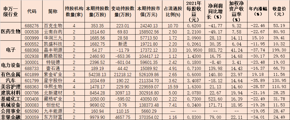 QFII持股方面,截至去年四季度末,QFII新進持有紫金礦業、凱盛科技、百克生物、九豐能源、壹石通等5只個股,新進數量分別為14103.83萬股、613.87萬股、138.01萬股、78.14萬股和44.42萬股;北新建材、華熙生物、華潤三九、云南白藥、鵬鼎控股等5只個股在去年四季度獲QFII繼續加倉操作,增持數量分別為2615.00萬股、259.90萬股、37.58萬股、29.04萬股和6.62萬股。