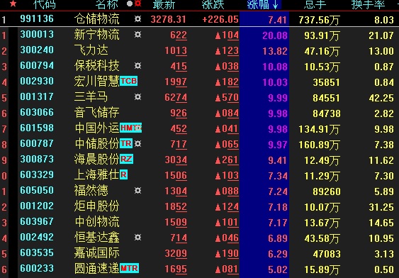 具體來看, 4月13日11:30,倉儲物流板塊再度爆發。截至上午收盤,板塊漲幅居首達7.41%。7只概念股集體漲停,新寧物流“20cm”漲停。值得注意的是,新寧物流、保稅科技等連續3個交易日漲停。