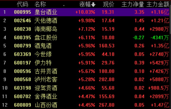 白酒概念板塊走強,其中,皇臺酒業(yè)和天佑德酒漲停,海南椰島、盤江股份、酒鬼酒、今世緣、伊力特、古井貢酒、瀘州老窖等個股漲幅均超5%。