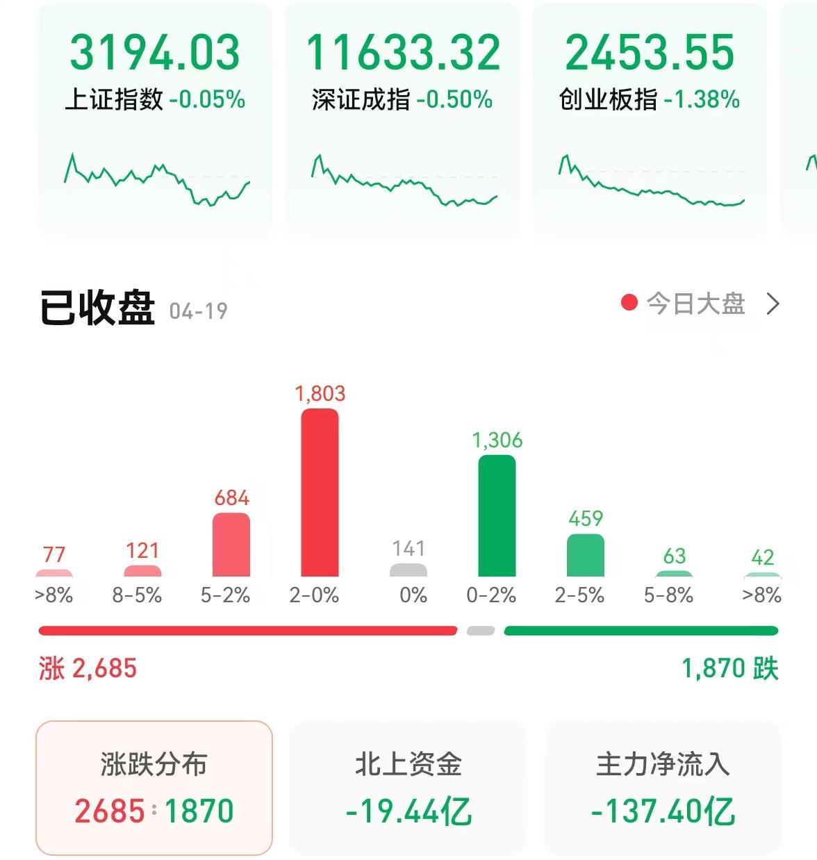 截至收盤,上證指數跌0.05%報3194.03點,深證成指跌0.5%報11633.32點,創(chuàng)業(yè)板指跌1.38%報2453.55點;兩市合計成交7793.9億元,北向資金凈賣出19.44億元。
