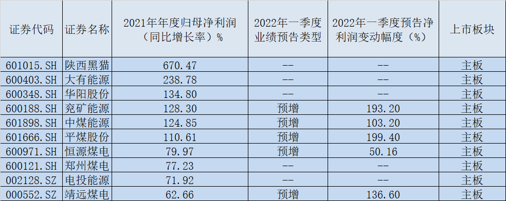 在多重利好因素推動下,部分公司業績表現可觀。同花順數據顯示,煤炭板塊內已有15家公司披露了2021年年報業績,報告期內,12家公司歸母凈利潤實現同比增長,占比80%。其中,陜西黑貓、大有能源、華陽股份、兗礦能源、中煤能源、平煤股份等6家公司歸母凈利潤實現同比翻番。