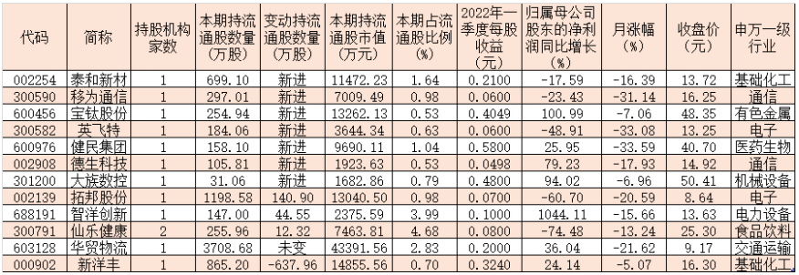 近幾年來,以養(yǎng)老金為代表的長線資金加速入市,而養(yǎng)老金持倉情況也成為市場關(guān)注的焦點。同花順數(shù)據(jù)顯示,截至4月21日15:40,在已披露2022年一季報的324家上市公司中,共有12家公司前十大流通股股東中出現(xiàn)養(yǎng)老金身影,合計持股數(shù)量為7905.51萬股,以2022年一季度末收盤價計算,合計持股市值達(dá)12.98億元。其中,有10只個股在今年一季度成為養(yǎng)老金新進(jìn)增持的重點品種。
