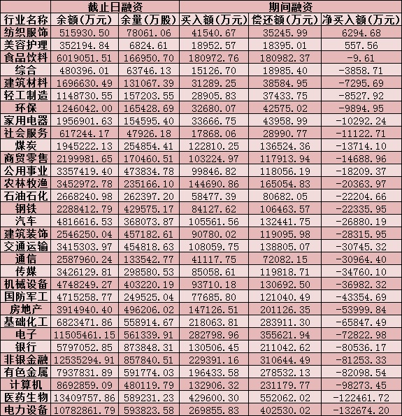 表:4月22日申萬一級(jí)行業(yè)兩融交易情況: