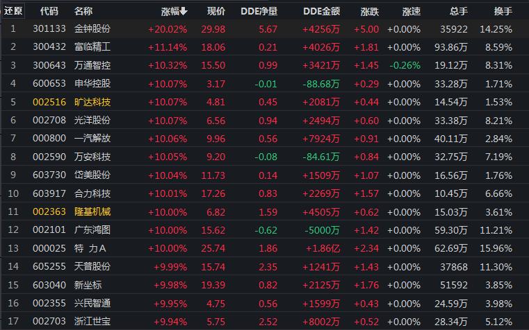 6月13日,汽車行業漲幅居首達2%,18只汽車股集體漲停,其中,金鐘股份20CM漲停。